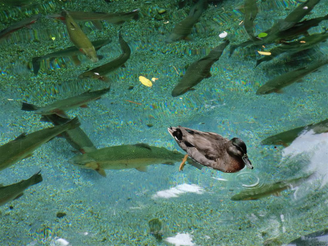 園内には綺麗な泉が湧き、野生のニジマスが泳ぎます。
